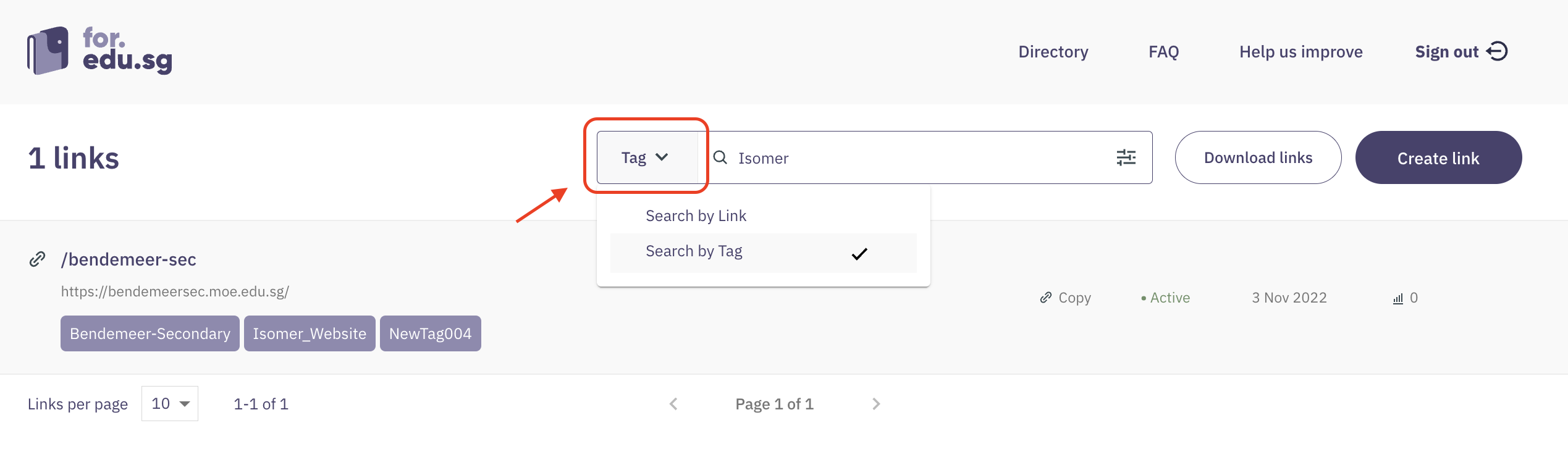 * On your dashboard, click on the dropdown in the search bar to toggle between search by Link or search by Tag, and type in the tag used for the shortlinks you wish to search for